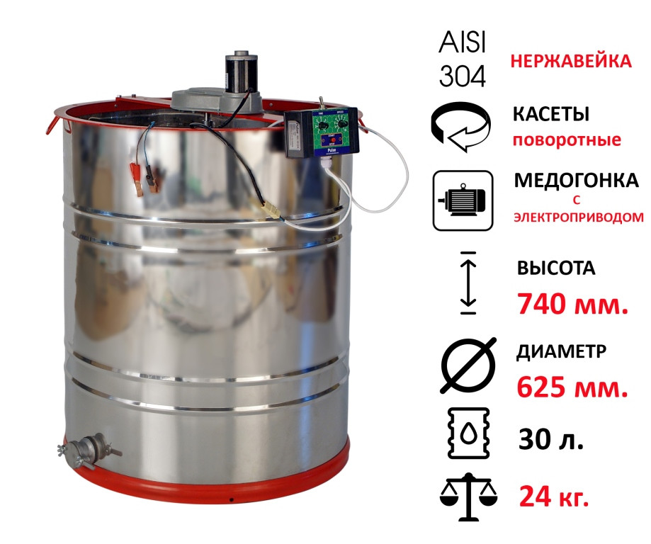 Медогонка 4-х рамкова з поворотними касетами, виготовлена з нержавіючої сталі, комплектується звареними нержавіючими касетами та ремінним електроприводом "Pulse" мод.1