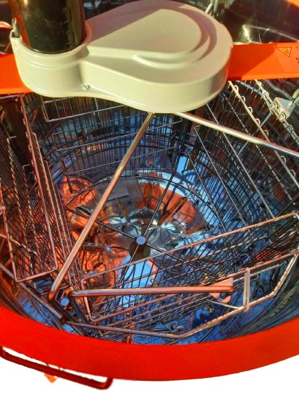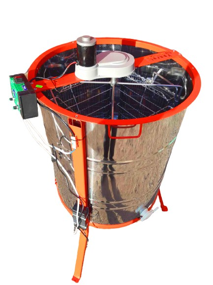 Медогонка 4-х рамкова, поворотна, бак з нержавіючої сталі, касети і деталі ротора в порошковому фарбуванні (порошкова фарба запікається в термокамері під високою температурою), кран пластиковий, який за бажанням можна замінити на нержавіючий з доплатою.