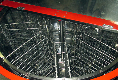 Потужність електродвигуна – 300Вт. Касети з рамками автоматично встановлюються в неробочому положенні по радіусу до центру і повертаються при обертанні ротора медогонки в той чи інший бік залежно від напрямку обертання ротора. Режим роботи медогонки встановлюється відповідними ручками на пульті блоку управління. Медогонка може працювати в ручному режимі або автоматично.