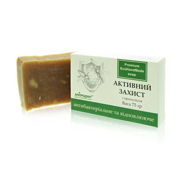 Склад: омилені олії кукурудзяна, кокосова, соняшникова; вода; Гідроксид натрія; мед, бджолиний віск, прополісна олія, густа витяжка прополісу.