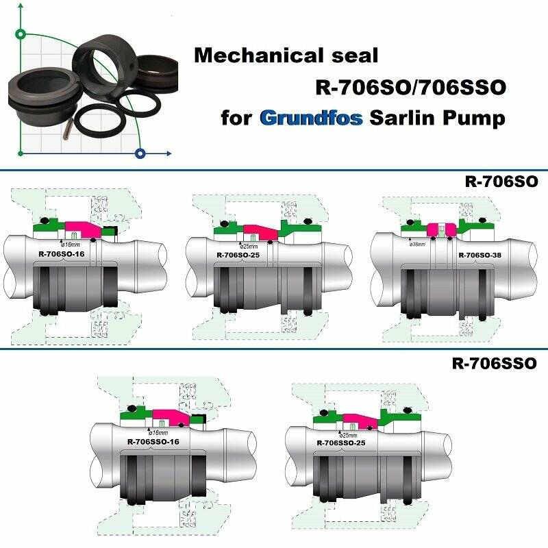 Ущільнення валу насосів Grundfos Sarlin R-706SO/706SSO застосовують при температурі -20°~180°C, тиску ≤1,2 МПа, швидкості ковзання до 10 м/сек. Артикул Grundfos до S1, fr46, YJ34520 96567331. Тип AESSEAL S0SU, AESSEAL S0SSU, Vulcan Type 86. Використання: Grundfos Sarlin S1074AL1511, SA, SV, SE.