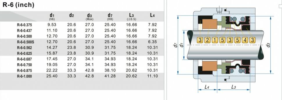 Механічне торцеве сильфонне ущільнення R-6 монтується на дюймові вали. Застосування: насоси для басейнів, мотопомпи, побутові насоси тощо.