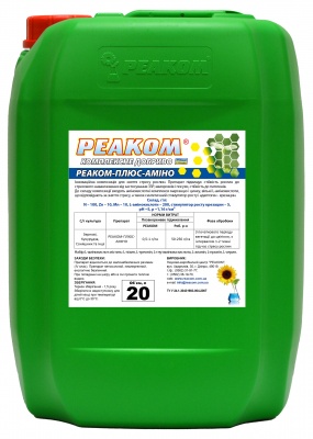 РЕАКОМ-ПЛЮС-АМІНО  - інноваційна композиція для зняття стресу рослин. Підвищує стійкість рослин до стрессового навантаження від застосування ЗЗР, заморозків та посухи, стійкість до патогенів. До складу композиції входять амінокислотні комплекси марганцю та цинку, вільні L-амінокислоти, що відповідають за зняття стресу, а також синтетичний стимулятор росту та адаптоген – Крезацин.