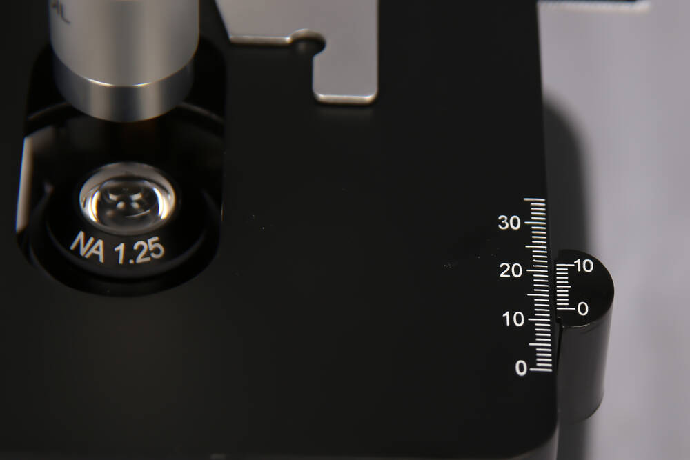 • Двокоординатний градуйований предметний столик з підшипниковим механізмом.