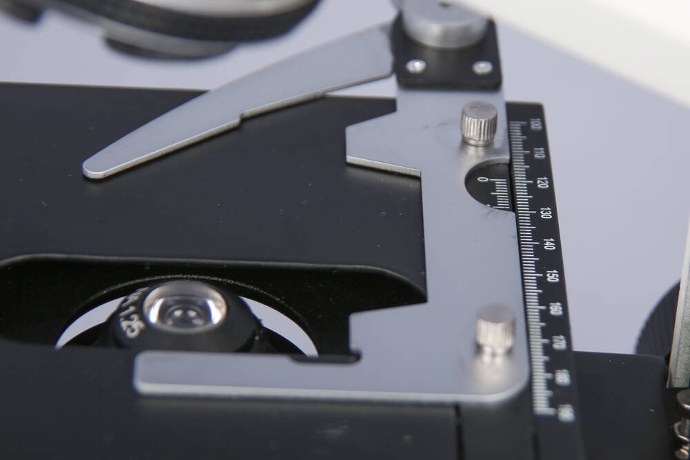 • Двокоординатний градуйований предметний столик з підшипниковим механізмом.