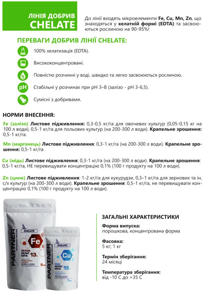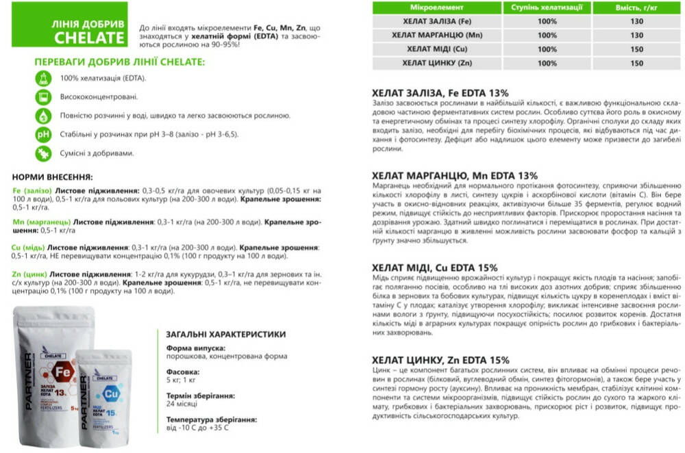 Линия удобрений CHELATE - В линию входят микроэлементы Fe, Cu, Mn, Zn, находящихся в хелатной форме (EDTA) и усваиваются растением на 90-95%!
