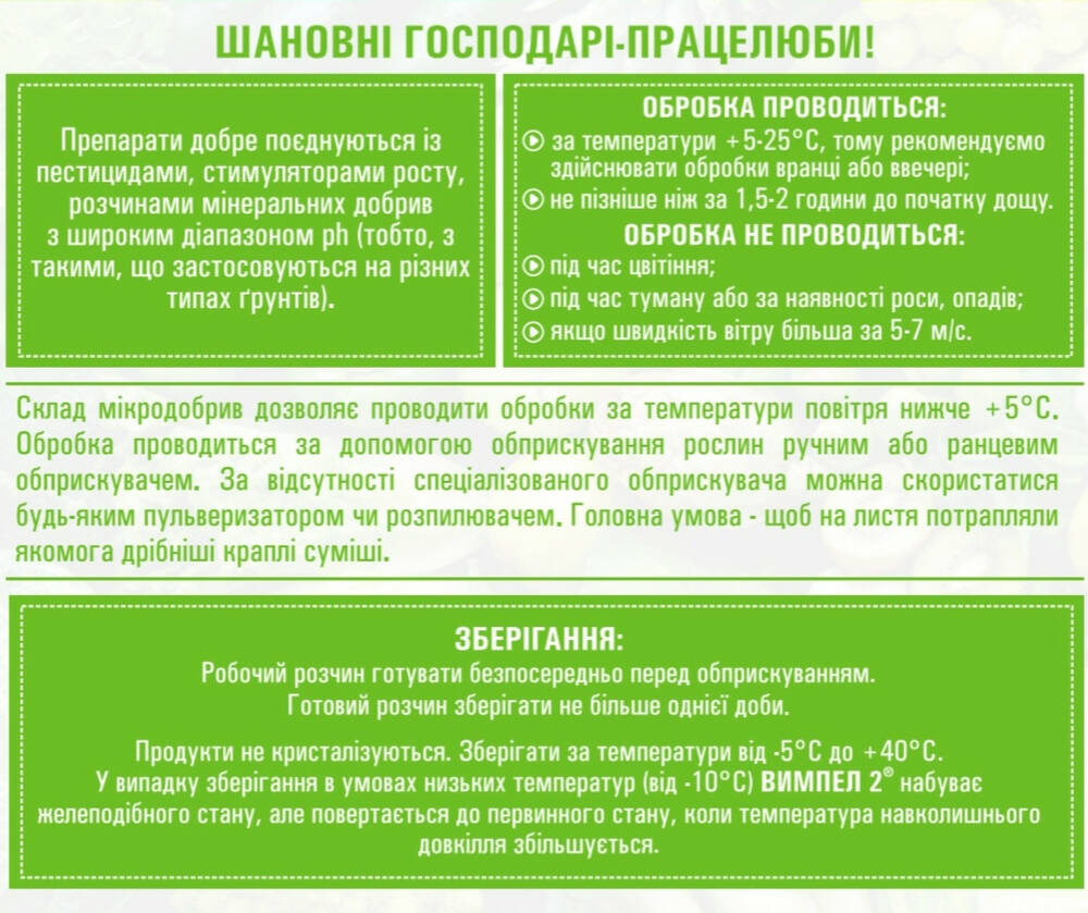 Для оптимального эффекта рекомендуется применять совместно со стимулятором роста растений Вимпел.