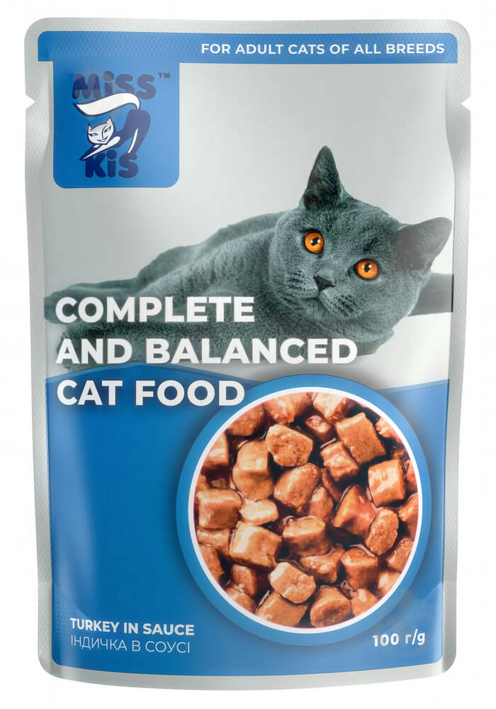 Вологий корм торгової марки “Miss Kis” індичка в соусі – спеціально розроблений рецепт який містить збалансовану комбінацію вітамінів, мінералів та мікроелементів, що підтримує на належному рівні імунну систему кішки, враховуючи всі її фізіологічні потреби. Містить в своїй основі м’ясо індички та субпродукти тваринного походження не менше 80%.