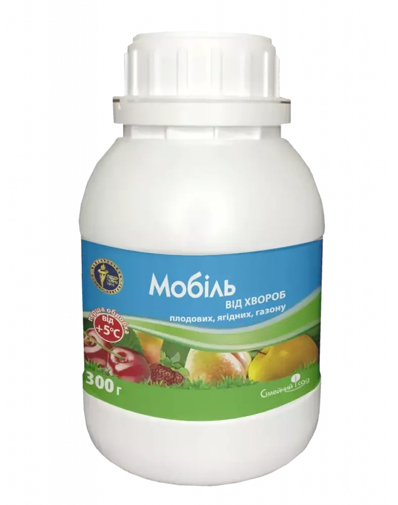 Препарат Мобіль являє собою фунгіцидом системної дії, що рекомендується для забезпечення захисту плодово-ягідних рослин, винограду та газонів від різних грибкових та патогенних захворювань. Основна активна речовина у його складі – ципродиніл, який блокує процес синтезу метіоніну, який потрібний фітопатогенам для зростання грибкових спор. Це сприяє пригніченню подальшого поширення грибкової інфекції. Після нанесення Мобіль активно проникає і поширюється в рослині від коренів до верхівок, при цьому основна його частина зосереджується у верхніх шарах рослини, запобігаючи проникненню патогенних спор. Мобіль ефективно працює навіть за низьких температур, починаючи від +3 °С, і за високої вологості. Наголошується, що холод не знижує ефективність дії фунгіциду, а при температурі вище 23 °С його робота посилюється, але тривалість захисту зменшується. Якщо застосовувати препарат відразу після виявлення перших ознак зараження, його лікувальна дія настає вже через 36 годин. Фунгіцид Мобіль успішно використовується для лікування яблуні, груші, персика, абрикоса, сливи, вишні, черешні, винограду, полуниці, газонних трав від парші, борошнистої роси, плодової гнилі, моніліозу, кокомікозу, плямистості листя, сірої гнилі, антракнозу, клятероспоріозу, курчавості листя, мілд'ю, оїдіуму.