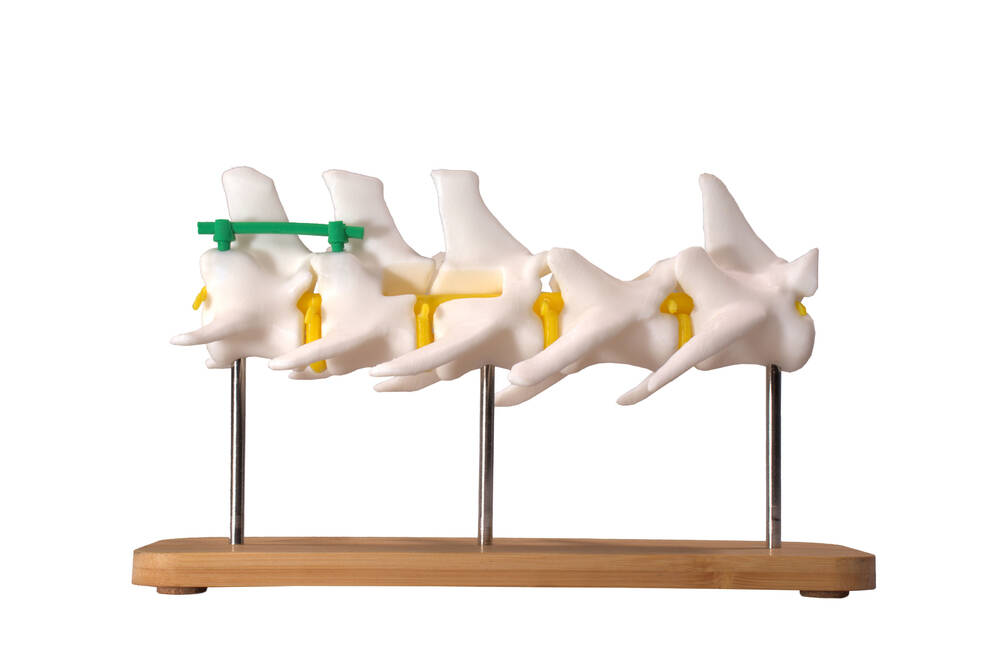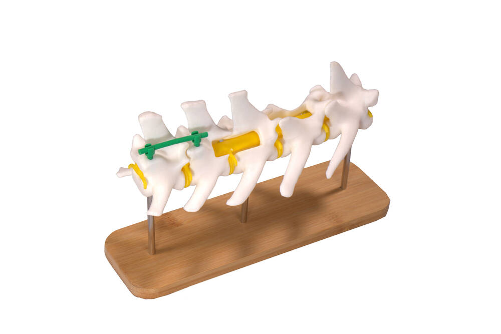 • Детальна анатомія: модель зображує 5 поперекових хребців, міжхребцеві диски, спинний мозок з корінцями нервів та систему транспедикулярных фіксаторів.