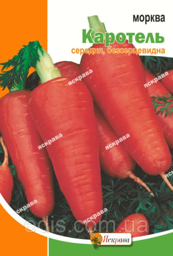 Морква Каротель 10 гСередньостиглий сорт. Вегетаційний період від сходів до технічної стиглості 100-110 днів. Коренеплід конічної форми, з тупим кінчиком, довжиною 14-15 см, масою 150-250 г, повністю занурений в грунт. Забарвлення поверхні, м'якоті і серцевини оранжевого кольору. Сорт стійкий до стрілкування, рекомендується для споживання в свіжому вигляді, переробки та зимового зберігання.