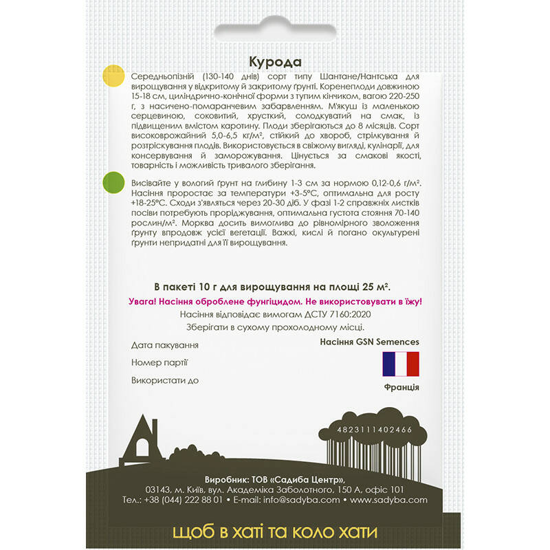 Курода - коренеплоди довжиною 14 - 18 см, яскраво - помаранчеві, з невеликою серцевиною, соковиті, солодкі та ароматні. Сорт чудово підходить для споживання у свіжому вигляді, приготування страв, переробки та зберігання. Чудово адаптується до будь - яких умов вирощування.