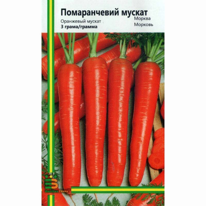 Морква Помаранчевий мускат - це ранній надійний сорт, який щорічно забезпечує хорошим урожаєм. Період вегетації від повних сходів до технічної зрілості становить 55-70 днів. Коренеплід циліндричний зі слабким збігом до кінчика, помаранчевий, довжиною 15-16 см, масою 100-160 грамів. У поперечному розрізі практично без серцевини. М'якуш соковитий, солодкий, з прекрасними смаковими якостями. Підходить для виготовлення дитячих соків та пюре. Відмінний сорт для збирання пучками, добре підходить для зберігання. Врожайність 2,7-6,5 кг/м2.