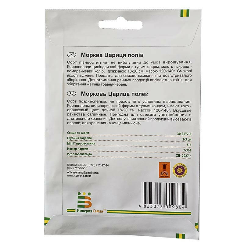 Морква Цариця полів - сорт пізньостиглий, не вибагливий до умов вирощування, для тривалого зберігання. Вегетаційний період 125-140 днів, від сходів до дозрівання.