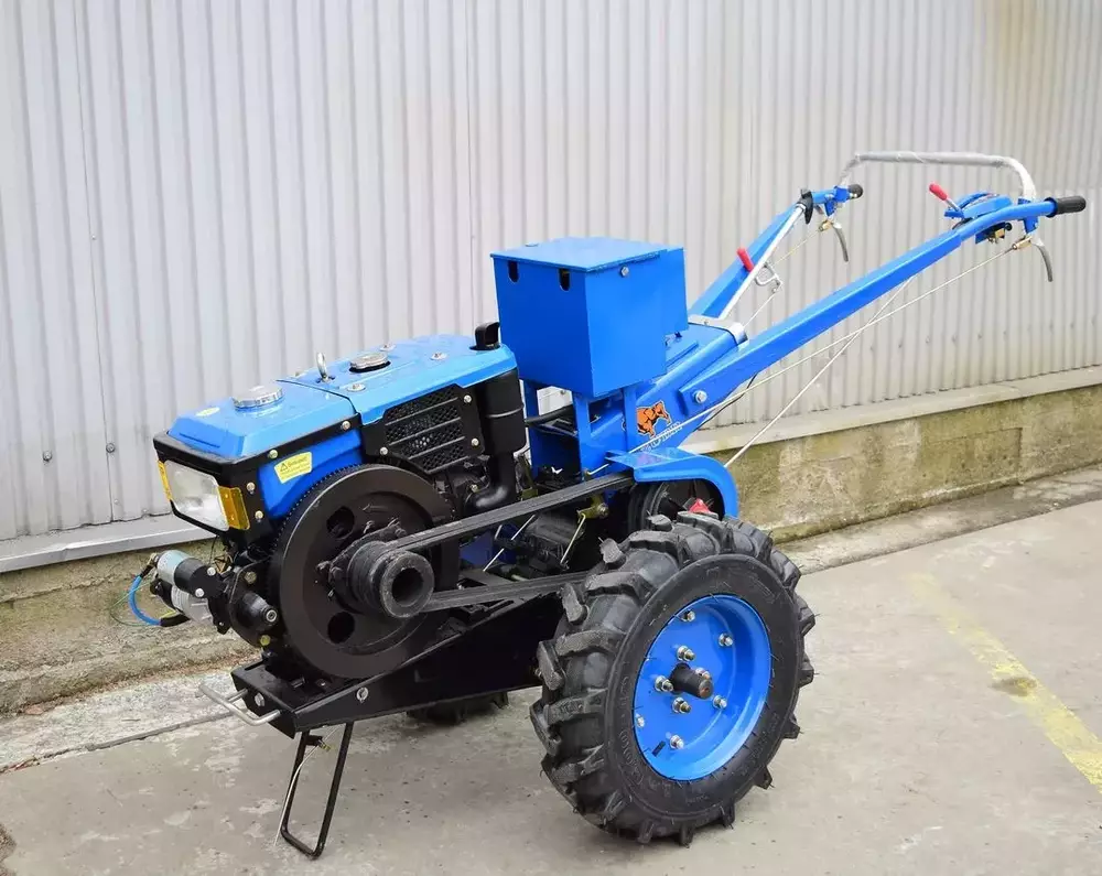 Також є задній шестерний вал відбору потужності для фрези і передній ремінний для підключення роторної сінокосарки та вібраційної картоплекопалки. За допомогою причепа можна перевозити вантажі до 500 кг.