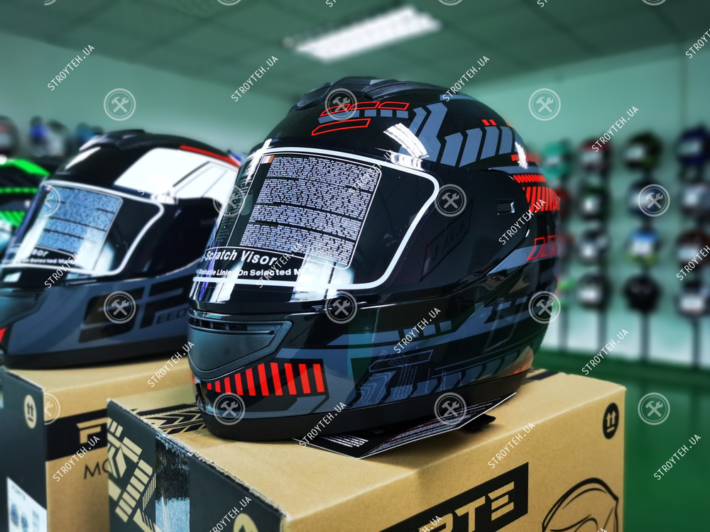 Мотошлем 902 Forte черно-красный, M Мотошлем 902 Forte - удобная и яркая модель выполненная в черно-красном цвете. Шлем выполнен из качественного ABS-пластика. Важным плюсом модели является сьемный подголовник.