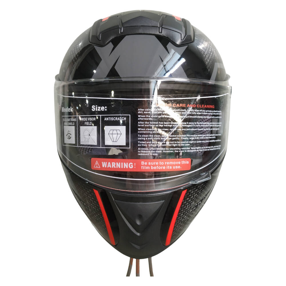 Опис мотошолома чорно-червоного кольору FORTE M61D Мотошолом чорно-червоного кольору FORTE M61D — засіб пасивного захисту голови водія при їзді на мотоциклі чи моторолері. Крім захисту голови у разі аварії, шолом оберігає від зустрічного вітру, води, каміння, комах та пилу.