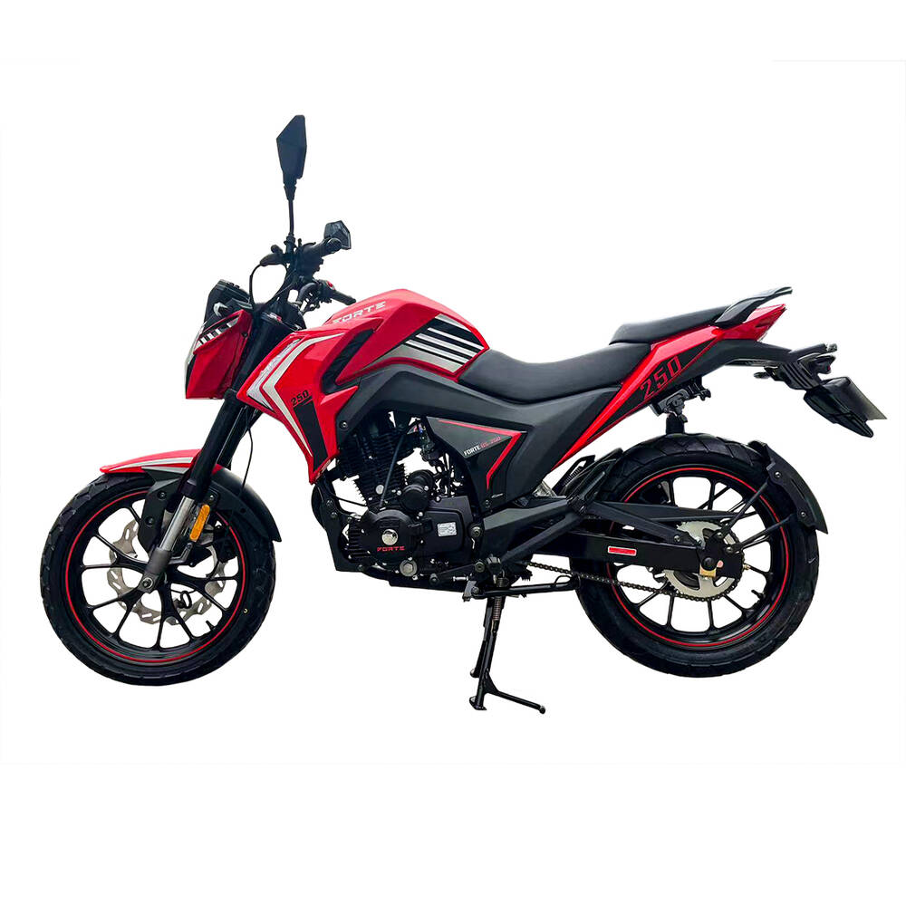 Опис Мотоцикл BS-250 Forte Чорно-червоний Особливості: Двигун з балансуючим валом Передні і задні гідравлічні дискові гальма з вентиляцією Новий дизайн спідометра і тахометра Задня підніжка для пасажира Сучасні легкосплавні диски Електронна панель приладів