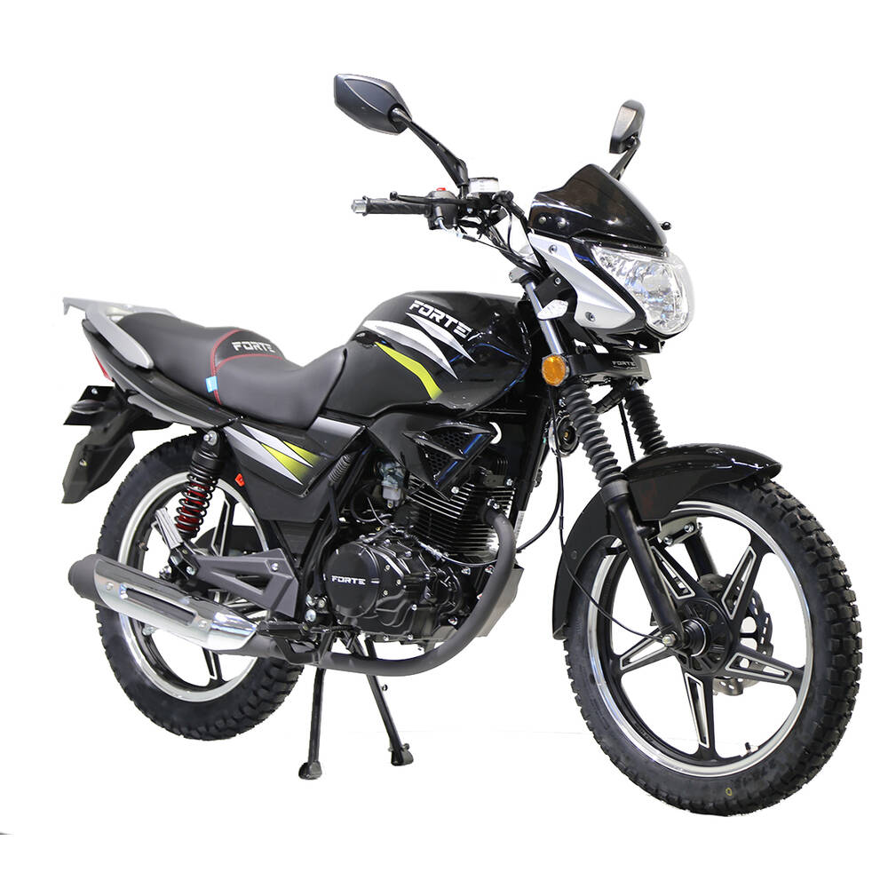 Опис Мотоцикл  FT 150EN Forte Чорний Особливості: Двигун CGB150 з балансуючим валом 9 кВт/12,0 к.с. при 8000 об/хв передні гідравлічні дискові гальма з вентиляцією блок-фара з LED показчиками поворотів новий дизайн LED спідометра та тахометра задня підніжка для пасажира легкосплавні диски