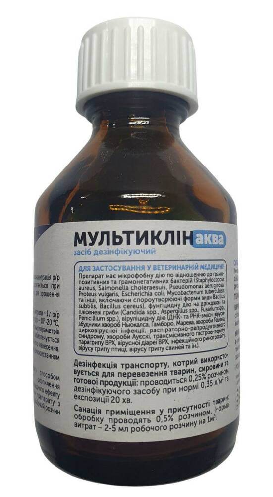 Мультиклін Аква – зберігає свою активність на інтенсивному світлі, при використанні жорсткої води, у присутності органічних матеріалів (залишки корму, тваринні виділення та ін.). Робочі розчини засобу Мультиклін Аква, призначені для дезінфекції різних об’єктів, готують у пластикових, емальованих (без пошкодження емалі) ємностях шляхом додавання до води відповідних кількостей засобу (Таблиця 1).