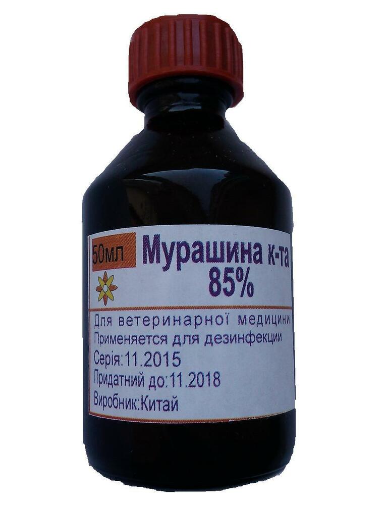 1.2. Для обробки бджіл, уражених вароатозом, застосовується технічна мурашина кислота марки А (вищий і перший сорт) та марки В, ГОСТ 1706-78, а також мурашина кислота ЧДА (чиста для аналізу), ГОСТ 5848-73 у концентрації 86,5% - 99,7%. Випаровування кислоти у вулику має бути близько 10 мл/добу.