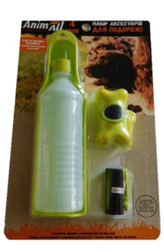 Ідеальний набір для прогулянок і невеликих подорожей із собакою від AnimAll. До набору входять: поїлка для води, диспенсер із пакетами для фекалій і запасна касета пакетів для фекалій