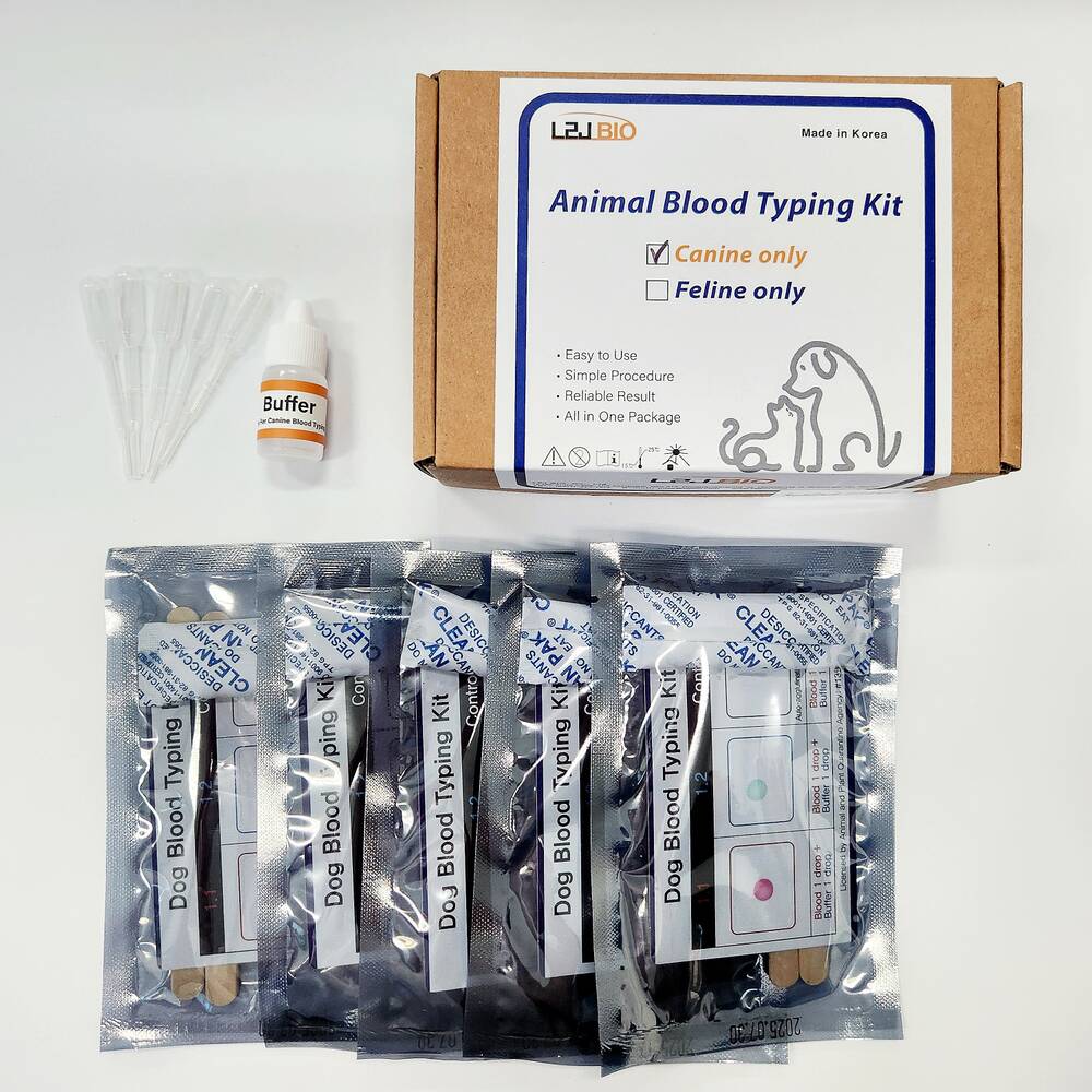 Canine Blood Typing Kit L2J BIO — це спеціалізований експрес-набір для визначення групи крові у собак, заснований на дії моноклональних антитіл до антигенів Kai 1 (DEA 1.1) та Kai 2 (DEA 1.2). Тест дає змогу швидко виявити сумісність для гемотрансфузії та уникнути небезпечних ускладнень.