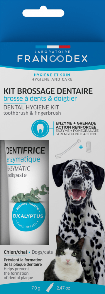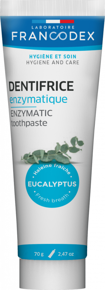 Регулярне чищення зубів ферментною зубною пастою FRANCODEX допоможе запобігти утворенню зубного нальоту та каменю, усуне неприємний запах з рота та видалить залишки їжі. Поєднання ензиму та граната, джерела вітаміну С, обмежує наявність бактерій і розвиток зубного нальоту та каменю. Карбонат кальцію - м'який абразив, який ефективно очищає зуби, не пошкоджуючи емаль. Щоб запобігти утворенню зубного каменю та зменшити ризик проблем із зубами, важливо змалечку забезпечити своєму улюбленцю регулярний догляд за зубами.