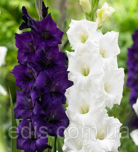 І сніжно-білий і магічний фіолетовий гладіолуси – дуже яскраві, красиві сорту. Комбінація цих двох сортів виробляє приголомшливий, магічний ефект і в букеті і на клумбі.
