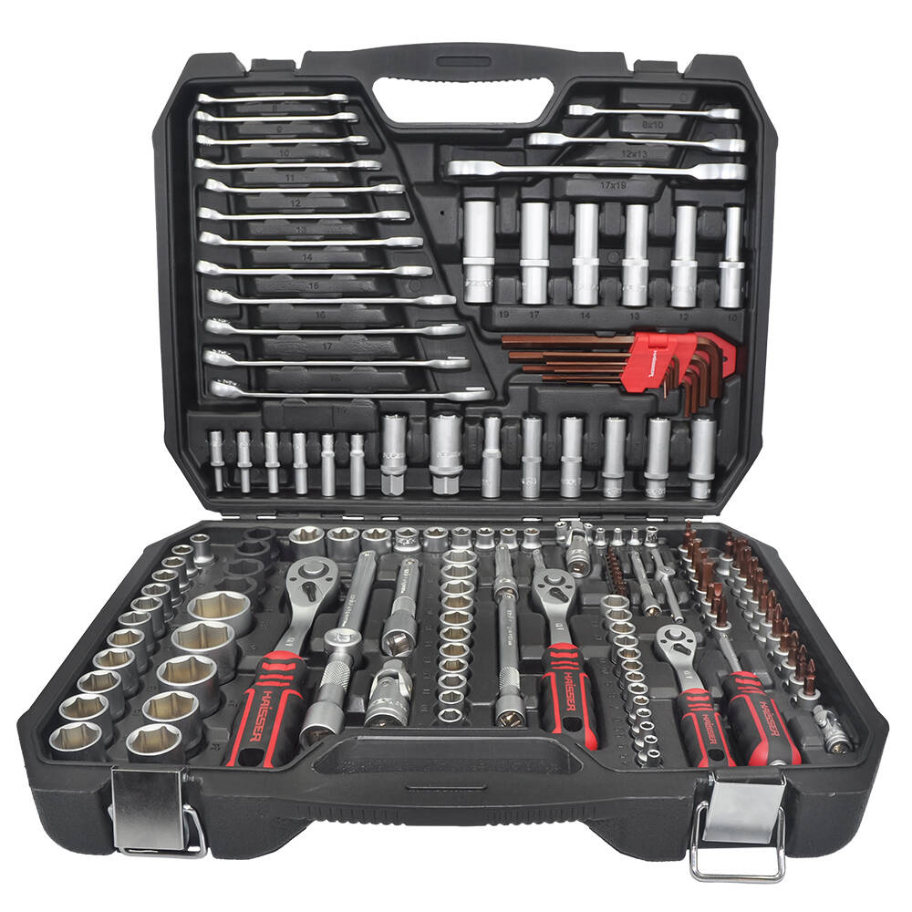 Опис Набір інструментів професійний 150 од. Haisser 70232 Професійний набір інструментів  1/2", 3/8", 1/4"  Haisser складається з 150 предметів. Інструменти виконані з якісної хром-ванадієвої сталі. Набір постачається в пластиковому кейсі,  Матеріал головки, ключі,  CR-V з подвійним сатіновим покриттям; Тріскачки механізм Тайвань з матеріалу CR-MO на 72 зуба; Біти матеріал S2 зі спеціальним оксидованим покриттям (не ржавіє)