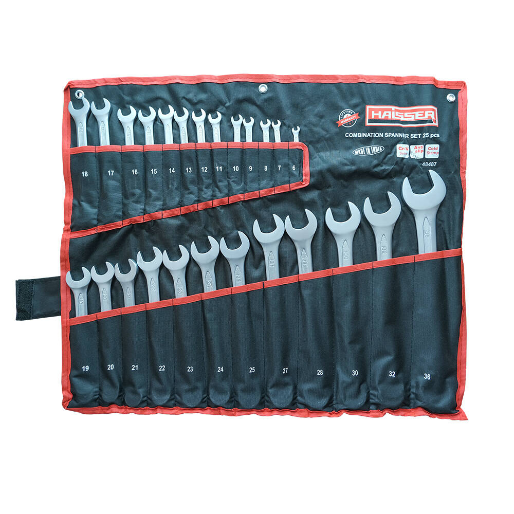 Опис Набір ключів комбінованих COLD STAMPED CRV із 25 од. SATINE, Haisser 48487 Набір ключів комбінованих COLD STAMPED CRV SATINE Haisser  - складається з 25 ключів в чохлі. Кожен з них виготовлений із високоміцної сталі     CrV  з покриттям сатин, має дуже високу корозійну стійкість. Висока якість інструменту забезпечує максимальну міцність, стійкість до зламу, тривалий період експлуатації. До набору входять ключі таких розмірів: 6-25, 27, 28, 30, 32, 36 мм Ключ ріжково - накидний Cold stamped Satin Haisser   - застосовується для створення різьбових з'єднань із застосуванням болтів, гайок та інших елементів, що мають шестигранний шліц. Підходить як для загвинчування, так і розгвинчування, дозволяє створити потужний важіль, необхідний для роботи зі складними з'єднаннями, пошкодженими (іржавими) деталями і т.д. Завдяки зручній формі, виріб добре лежить у руці, не вислизає у процесі роботи. Виготовлений із високоякісної хром - ванадієвої сталі CrV с сатин - хромовим покриттям, яке надійно захищає інструмент від корозії, ключ холодного штампування з підвіскою.