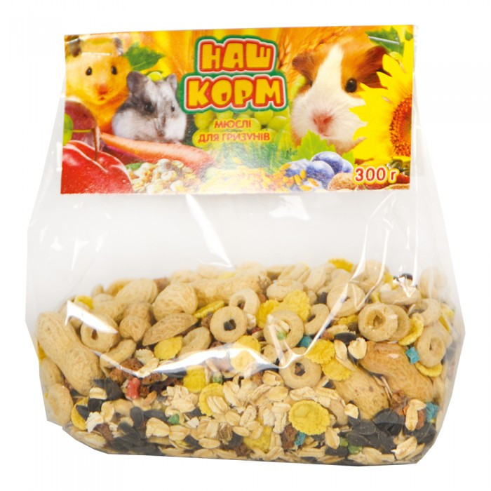 Наш Корм мюслі для гризунів 300 г Оновлена серія доповнень і ласощів до базового корму в новій сучасній упаковці. Мюслі – смачна і поживна добавка до основного раціону. Підходить хом'якам, мишкам, морським свинкам, кролям, дегу. Містить добірні злаки, подрібнені шматочки фруктів і ягід, висушених за особливою технологією з збереженням всіх живильних речовин і мікроелементів. Є додатковим джерелом вітамінів.