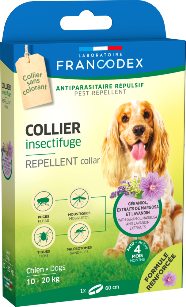 REPELLENT COLLAR FRANCODEX не містить ПВХ і фталатів, виготовлений із гераніолу, маргози та екстракту лавандину, що відлякує комах, захищає від будь-якого зараження паразитами. Ваша собака захищена протягом 4 місяців. Нашийник має систему безпеки, яка дозволяє нашийнику зламатися в разі випадкового вдавлення. Упаковка виготовлена ​​з 100% переробленого картону, щоб допомогти зменшити наш вуглецевий слід.