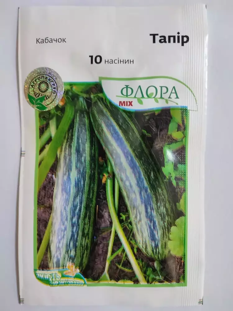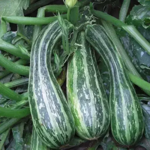 Вид - Цукіні. Смугастий сорт циліндричного кабачка. Зелене забарвлення з білими смугами плода. Відмінний смак і товарний вигляд. Для весняно-літнього вирощування у відкритих грунтах і плівкових теплицях.