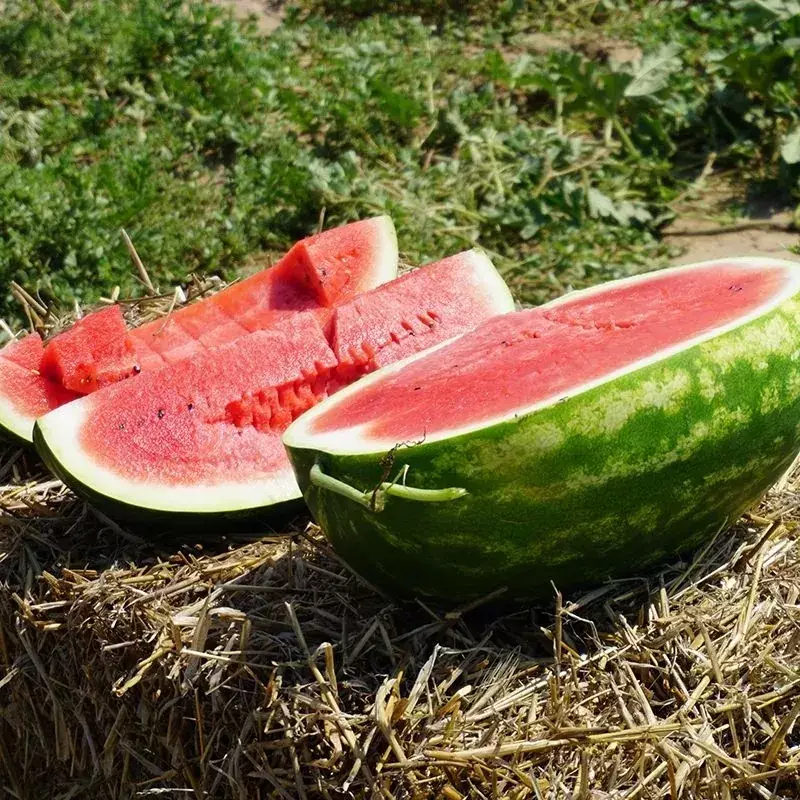 Подовжена форма, темно-зелені смуги та вирівняність роблять партію помітною на прилавку. М’якоть щільна, хрустка, насичено-червона й дуже солодка — формат Crimson Sweet, який добре «читається» покупцем. Середня маса 10–12 кг з потенціалом до 14 кг дає конкурентний калібр; щільна кора забезпечує транспортабельність без втрат якості, що важливо для далеких відправок і гуртових поставок.