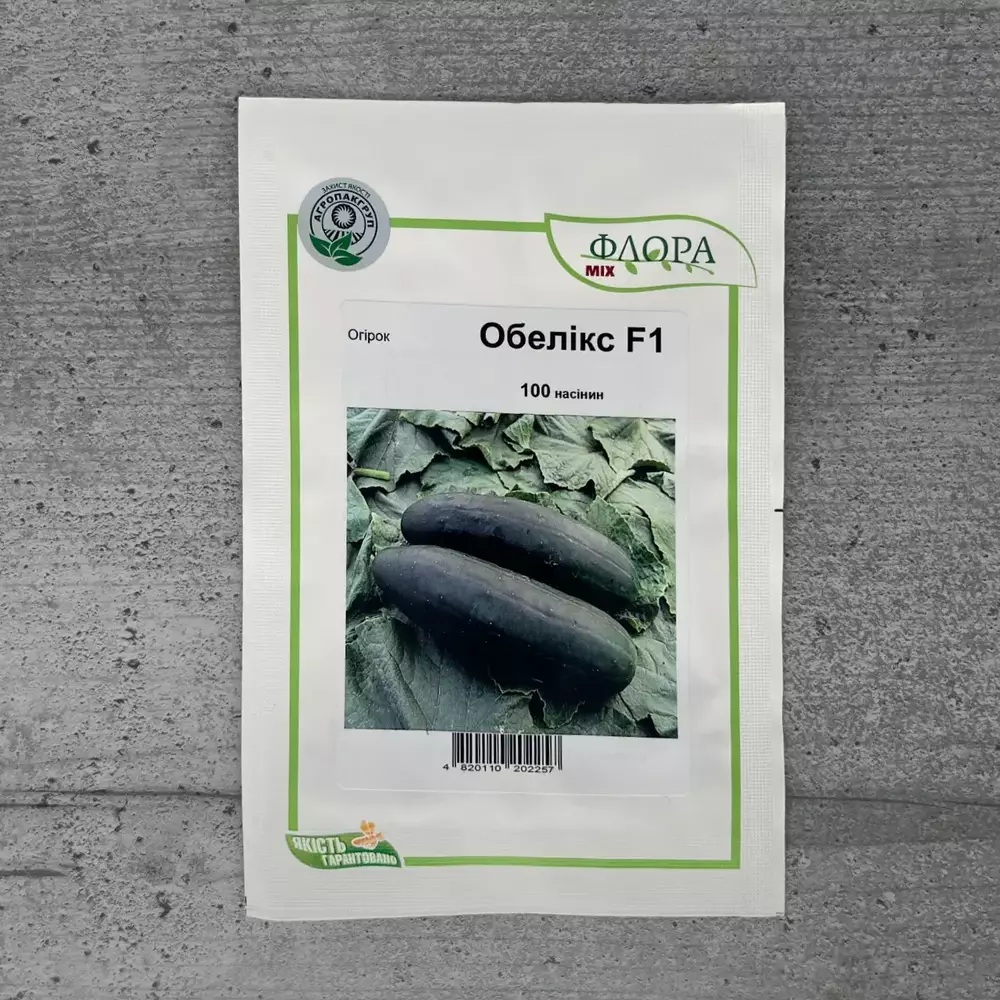 Обелікс F1 - високоврожайний середньоранній гібрид салатного призначення. Рослина має потужну силу росту та добре переносить тимчасові зниження температури. Плоди темно-зелені, довжиною 20-22 см, з маленькими бугорками. Генетично відсутня гіркота. Має високу стійкість до борошнистої роси та хорошу регенерацію. Призначається для свіжого ринку. Вирощується у відкритому ґрунті.