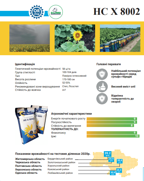 НСХ 8002 — це середньоранній сербський гібрид соняшника для технології вирощування під гербіцид «Sumo», з потенціалом врожайності до 58 ц/га. Відзначається високою толерантністю до поширених захворювань, таких як фомопсис та іржа, а також стійкістю до рас вовчка A-F. Завдяки високому вмісту олії (52-55%) та відмінним показникам посухостійкості, гібрид підходить для вирощування у всіх кліматичних  зонах України.