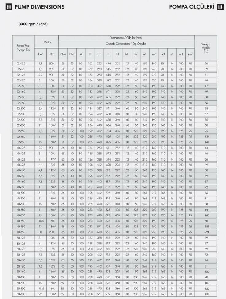 Технічні дані: Нагнітальний фланець: DN32 ... DN150. Потужність: до 550 м³/год. Висота : 105 м. Швидкість: 1450-3600 об/хв (50 Гц-60 Гц). Робоча температура: -10°C’ до +105°C. Тиск в корпусі (Pmax): 10 бар (16 бар).