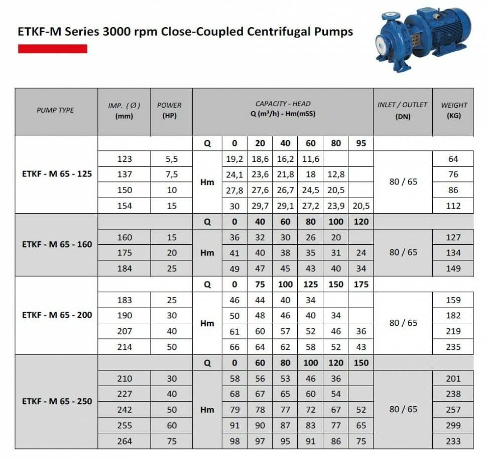 Відцентрові моноблочні насоcи ETKF-M з муфтовим з’єднанням призначені для перекачування неабразивних чистих і умовно чистих рідин. Розміри насоса відповідають стандарту TS EN 733. Фланці всмоктування та нагнітання відповідають стандарту ISO 7005-2/PN 16. Ущільнення робочої камери забезпечується механічним ущільненням. Використовується закрите робоче колесо.