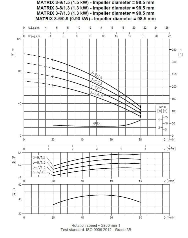 Технічні дані: Продуктивність до 27 м3/год. Висота подачі до 104 м. T.E.F.C. 2 полюсний двигун. Клас ізоляції F. Ступінь захисту IP 55. Робоча напруга: однофазні 220V, 50 Hz, трифазні 380V, 50 Hz. Вбудований конденсатор і автоматичний захист від теплового перевантаження для однофазної версії. Для трьохфазної версії захист від теплового перевантаження повинен забезпечити
