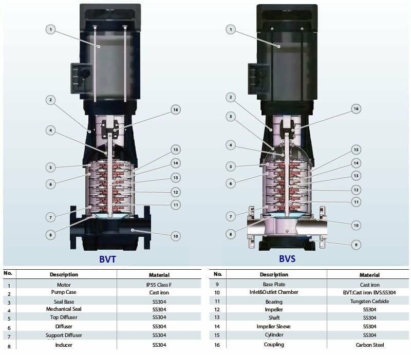 Багатоступінчасті насоси BVS з нержавіючої сталі AISI 304 підходять для систем промислової обробки, систем мийки та очищення, перекачування кислот і лугів, фільтрації, підвищення тиску, очищення води, кондиціонування, зрошення, систем протипожежного захисту.