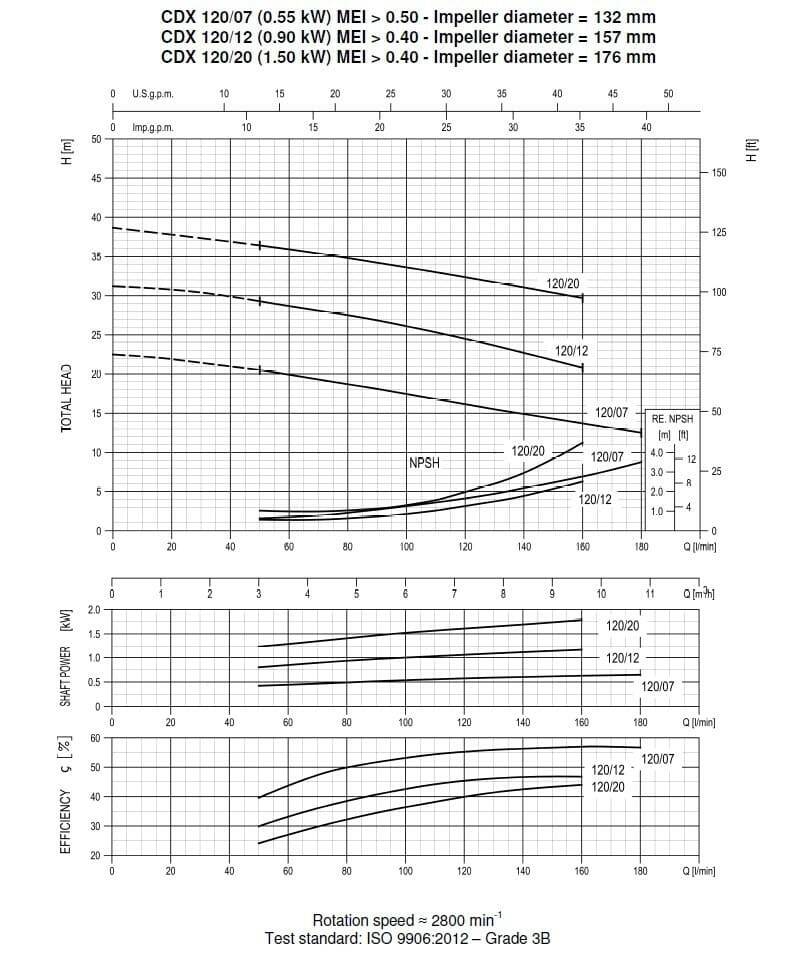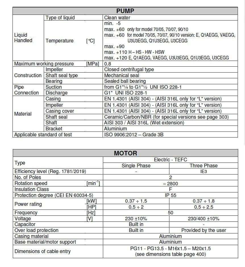 Технічні дані: продуктивність до 15 м3/год; висота подачі до 42 м; T.E.F.C. 2 полюсний двигун; клас ізоляції F; Степінь захисту IP 55; робоча напруга: однофазні 220V, 50 Hz, трифазні 380V, 50 Hz; вхідний патрубок 1" 1/2 для CDX 200, 1" 1/2 для інших моделей; вихідний патрубок 1"