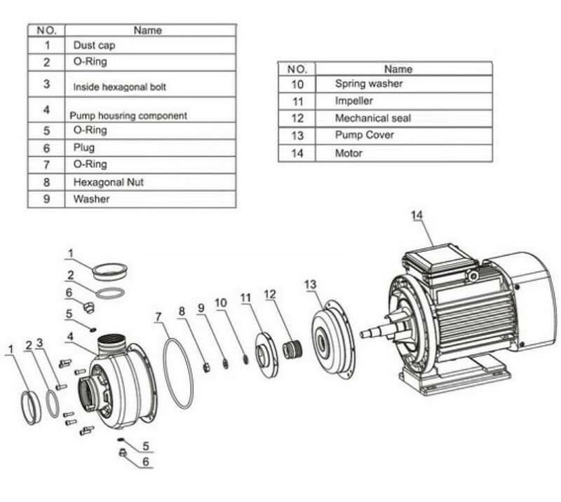 Проточна частина відцентрових насосів серії DWO (корпус, робоче колесо, днище, вал) виготовлена із нержавіючої сталі AISI 304. Насоси DWO являють собою одноступеневі моноблочні насоси з відкритим робочим колесом. Робоче колесо розміщене на подовженому валу електродвигуна, а робоча камера герметизована торцевим механічним ущільненням, за рахунок такої конструкції насос простий в експлуатації і обслуговуванні.