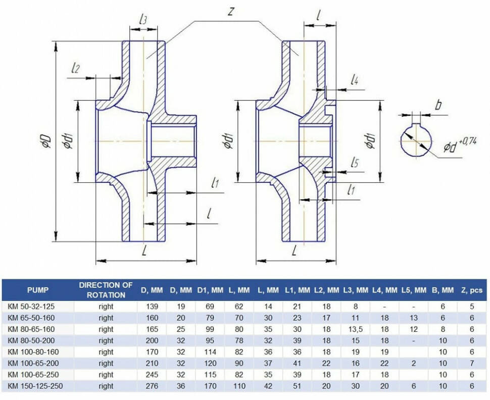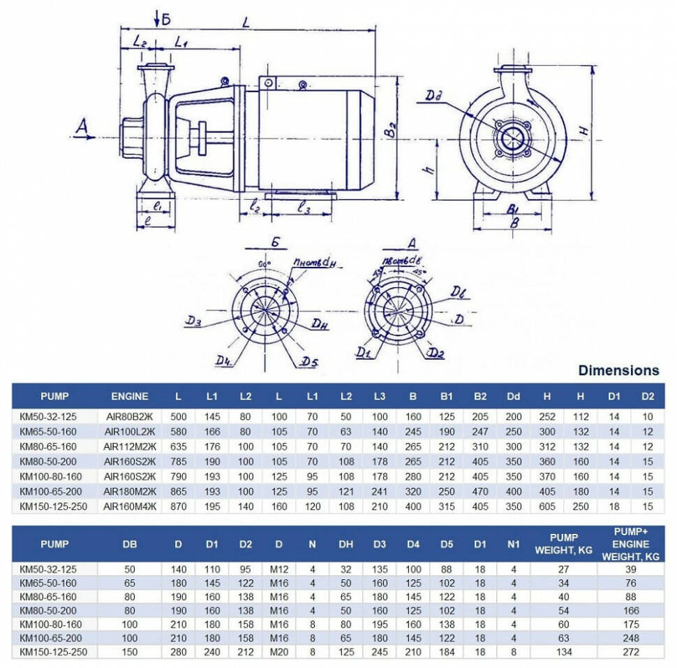 Консольні відцентрові насоси типу КМ призначені для перекачування чистої води (крім морської) з pH 6…9, та інших подібних до чистої води рідин за щільністю, в’язкістю і хімічною активністю. Працюють в стаціонарних умовах з температурою в діапазоні від 0 до + 85°С. Рідини, що перекачуються, не повинні містити механічних домішок за обсягом більше 0,1% і розміром більше 0,2 мм. Ущільнення вала насосів - одинарний сальник. Матеріал деталей проточної частини - сірий чавун. За спеціальним замовленням агрегати виготовляються із подвійним сальниковим ущільненням (СД) для перекачування рідини з температурою до плюс 105°С та торцевим ущільненням (Т).