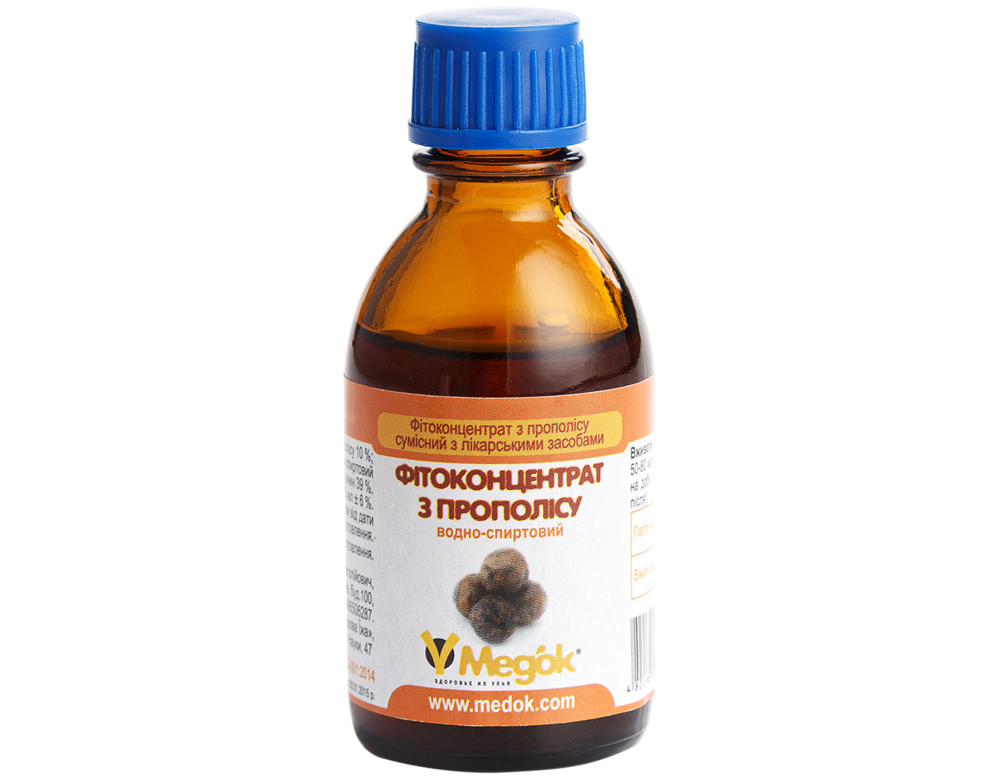 Склад: прополіс 10%, розчинна речовина – водно-спиртовий розчин.