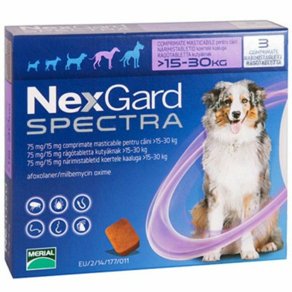 Merial NexGard Spectra (L) - НексГард Спектра - наступне покоління інсектоакарицидних препаратів системної дії від бліх і кліщів Фронтлайн НексГард для собак. Препарат НексГард Спектра є комбінованим протипаразитарним лікарським препаратом і діє не тільки на зовнішніх паразитів, але і ефективний проти різних видів гельмінтів: аскарид, волосоголовці і анкілостом, а також захищає собак від дирофіляріозу.