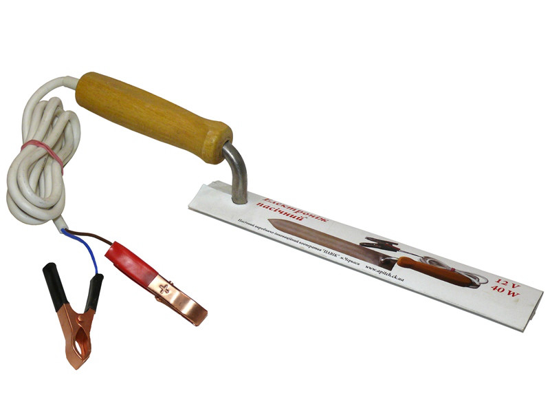 Ніж з електричним підігрівом застосовується для друку медових рамок. Завдяки постійному підігріву, продуктивність ножа набагато збільшується в порівнянні з іншими моделями пасічних ножів без підігріву. Лезо даної моделі пасічного ножа шириною 40мм, довжиною – 230мм та товщиною 2 мм, виготовлене з нержавіючої сталі. Потужність електро ножа 40 Вт. Робоча напруга 12-15 V. Ніж модна підключити до таких джерел живлення як: - автомобільний акумулятор 12 V
