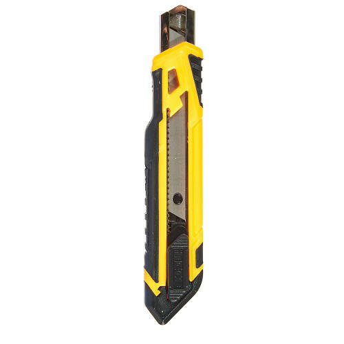 Корпус ножа оснащений міцними металевими напрямними, що підвищують зносостійкість інструмента. Спеціальна кнопка-фіксатор запобігає мимовільному висуванню леза, а антиковзка накладка забезпечує безпечне та комфортне утримання ножа під час роботи.