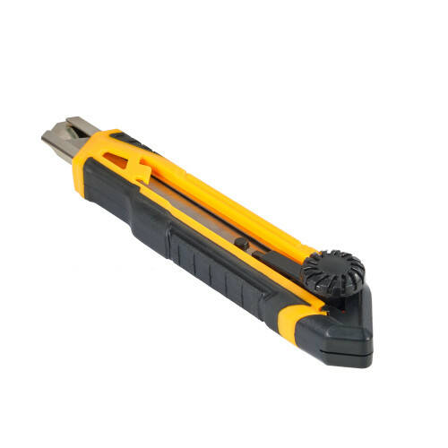 Корпус ножа виготовлений з ударостійкого матеріалу, що підвищує надійність у використанні. Спеціальна кругла кнопка-фіксатор утримує лезо у потрібному положенні, запобігаючи його мимовільному висуненню. Антиковзка накладка забезпечує зручність роботи та безпеку.