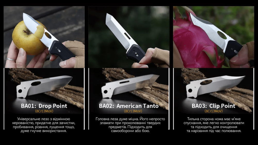 • ніж виготовлений зі сталей 8Cr13MoV та 420;